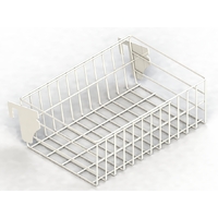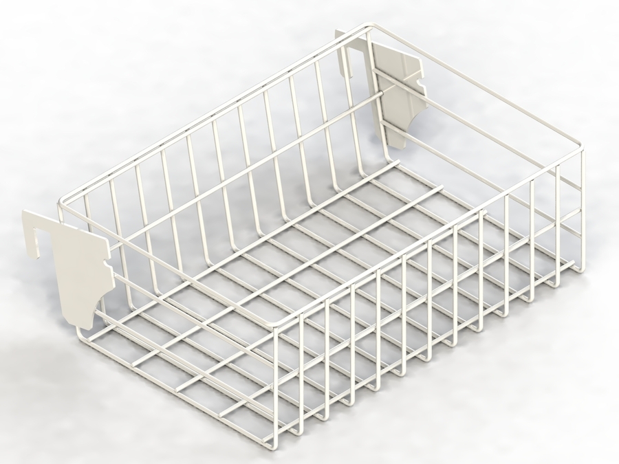 A wire mesh basket with hang bar mount, designed for convenient product display and organised retail merchandising. Durable and practical, it offers an efficient solution for showcasing smaller items in busy retail environments.